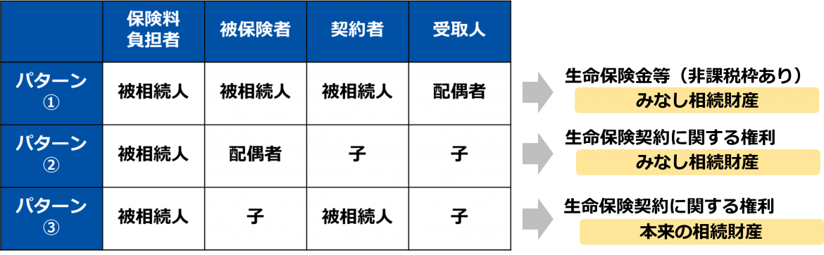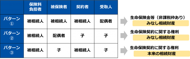 ⇒死亡保険金は「みなし相続財産」として相続税の対象(非課税限度額の適用あり)。